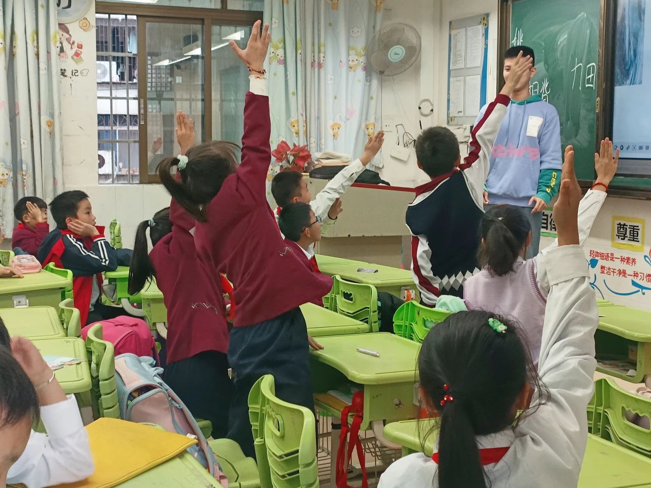 课堂中,小姚老师声情并茂地向小朋友们介绍造字法中的会意和形声知识。同时,小姚老师设置的课堂小游戏充分调动了小朋友们回答问题的积极性,小朋友们纷纷举起小手,参与到课堂互动中,知识的火花在思考互动中迸发。