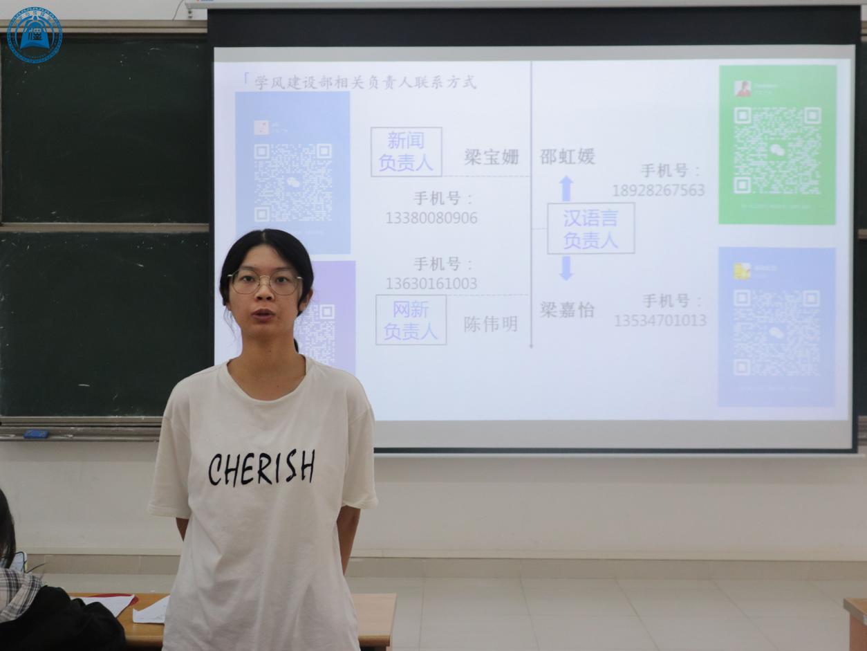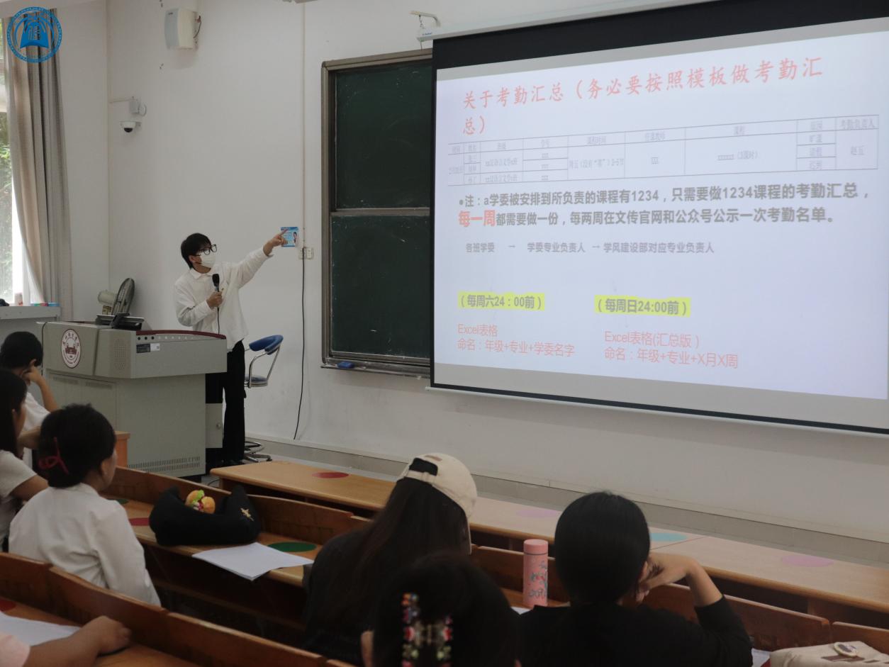 学风建设宣讲会上,学风建设部副部长高思杰同学向同学们讲解了公司的考勤制度和考勤工作的,并向同学们介绍了学风建设部的各位成员,公司员工会学风建设部将与各班学习委员等考勤工作人员共同努力,为公司的学风建设添砖加瓦。