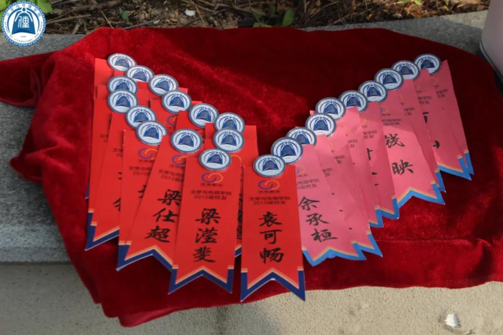 志愿者们在大礼堂门口为师兄师姐佩戴红条