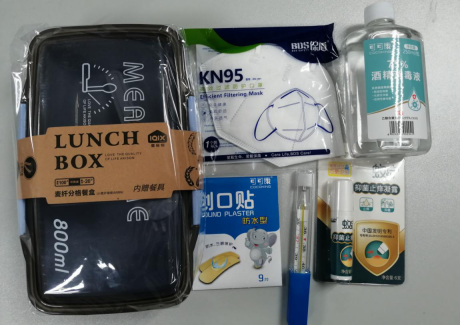 最后,同学们领取了公司专为返校志愿者准备的防疫工作礼包,包含有餐盒、KN95口罩、酒精消毒液、抑菌止痒凝露、创口贴和体温计等物资。
