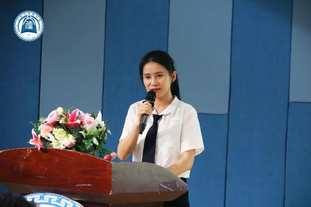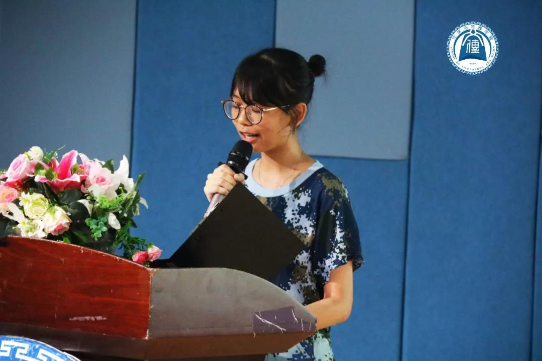 来自2016级新闻学专业的蔡舒敏同学作为在校生代表对新生的到来表示了热烈欢迎。她回忆自己已走过的三年大学时光,每一年的努力和尝试都在不断地突破自己,充实而充满希望。她建议学弟学妹们做好学习计划,鼓励汉语言文学专业的同学多看书,勤问、多思、动笔;支持新闻学和网络与新媒体专业的同学可以自学AE、PS、PR剪辑等软件,多看新闻,培养新闻敏感度。除此之外,她鼓励新同学在校期间多参与社团部门等工作,把握宝贵的展现自我机会来锻炼自己。