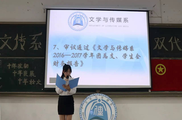 双代会是我系一年一度的重大会议,旨在对上一年的工作进行总结,并选举出新一届团学委员会委员。会议伊始,全体起立奏唱团歌。随后廖然老师为本次双代会致开幕词,她对过去一年团学干部勤恳的工作态度和辛勤付出表示肯定和感谢,同时她也期望新一届团学委员能继承我系敢闯敢拼的优良作风,谱写出属于文传人美好的新篇章。