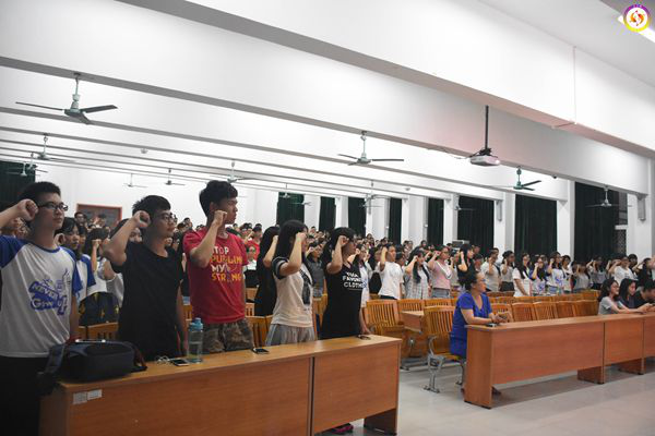 动员大会在全场师生共同奏唱共青团团歌中拉开序幕。李克和教授肯定了团总支、员工会去年的工作表现,表达了对新干事们不断巩固专业知识,锻炼组织能力、演讲能力以及社会适应能力的期盼。