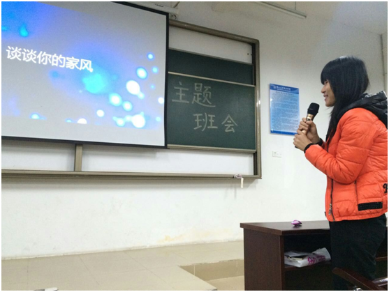 3月22日晚,文传系14级汉语言文学2班在9教104举办了一场“谈家风”主题班会,并邀请了班主任黄年丰老师参加。黄年丰老师首先分享了她对家风的理解,并引导同学们思考:什么是“家风”?