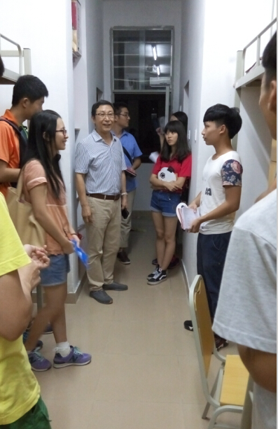 9月5、6日,我系顺利完成2015级新生报到工作,共有403名新生加入文传系这个大家庭。9月7日晚上7点,我系主任孙立教授带领我系专职教师、系两办行政教辅人员走访新生宿舍。孙主任亲切慰问了我系新生,了解新生入学后的生活情况。孙主任还将我系的实践教学成果系刊《文荃》报、《蓝鸟》报和《心瀚》杂志赠予新生阅读。