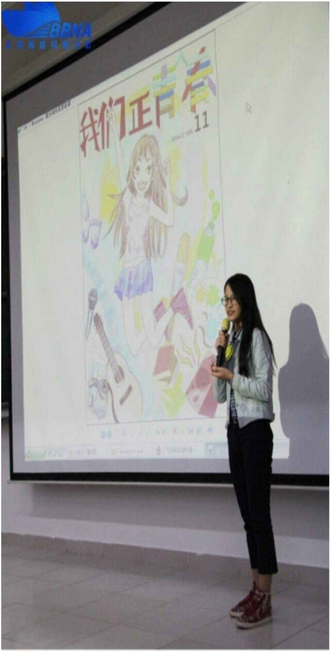 本次比赛共吸引一百多名同学参与。经过初赛筛选,共有十份作品进入决赛。决赛分为两个环节,分别是杂志封面设计和即兴创作。第一个环节中,参赛的十个小组选手依次上台进行作品展示及讲解。其中,1号小组选手黄楷霓和林鹏展示的《青春飞扬》是一个在平地上跃起的女孩,表现出青春的动感;2号选手刘倩茵设计的封面是一个坐在草地上、背靠单车读报纸的人,简单的设计风格表达出青春可以热情,也可以安静。评委温灵老师评价该封面干净,以草地做背景显得有生命力,字体的设置也很漂亮;10号选手唐国璐展示的手绘封面《我们正青春》,评委杨春老师表示手绘有创意,但毕竟是杂志封面,要注意添加文字素材。