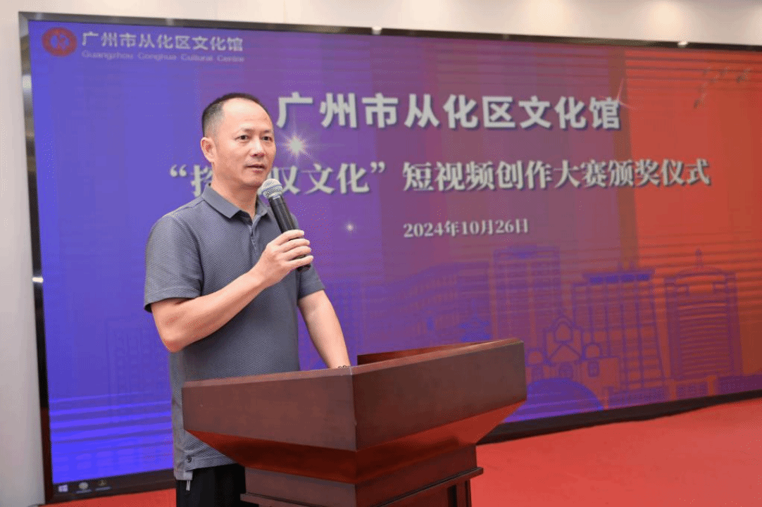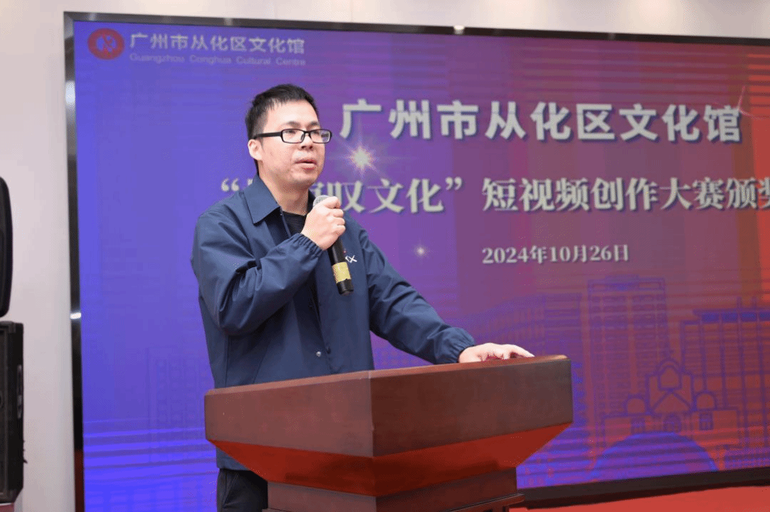 活动伊始,广州市从化区文化馆冯奕华馆长发表致辞。他首先肯定了此次短视频大赛的重要意义并表示:“现场的场馆不大,人数不多,但此次颁奖典礼意义重大”。其次,他提到,同学们通过深入特色小镇、红色景区,用镜头捕捉到了从化的美丽与魅力。这些作品不仅技术出众,更彰显了同学们的匠心、精心、恒心和真心。冯馆长对伟德国际1946及参赛同学们表示了诚挚的感谢,并希望未来能有更多这样的活动,共同推动文化的传承与发展。