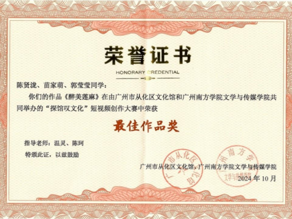 吴晓华同学作为《从化莲麻》作品的代表发表了获奖感言。她首先对组委会及指导老师表示了感谢,并说到他们团队把想法和对文化热情转换为现实的不容易。另外,她提到,这部作品不仅凝聚了团队成员的心血与汗水,更承载了他们对从化文化的热爱与追求。她表示,将带着这份荣誉与鼓励,继续创作更多优秀的作品,为文化传承贡献自己的力量。