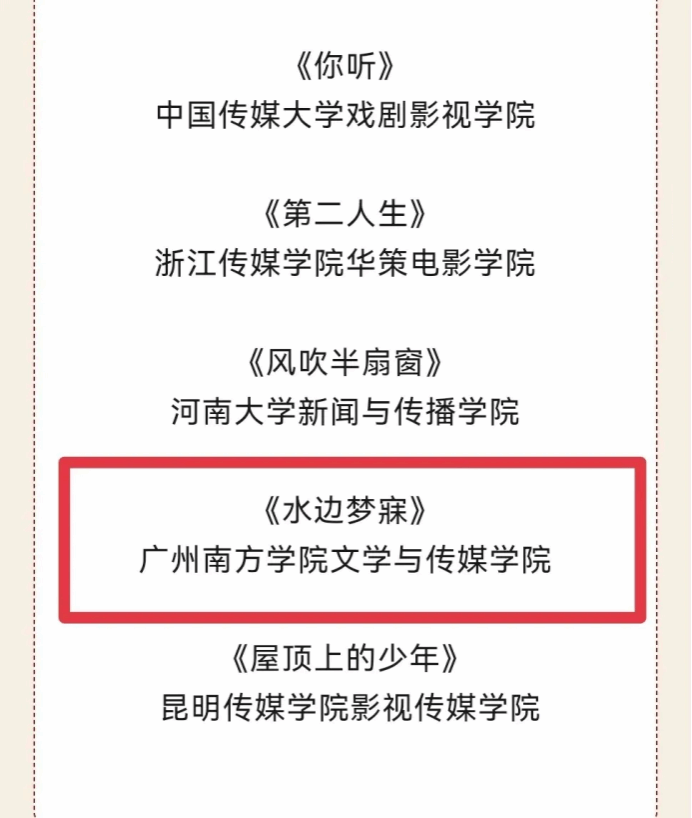 芳华灼灼,喜报沓至。2024年10月10日,中国高等院校影视学会2023—2024年度影视作品推优活动终评名单揭晓。伟德国际1946新闻与传播系邱察副教授指导的员工团队(团队成员:宋佳、黎馨徽、陈一鸣、吴沐萱、阙艺琳),凭借剧情片《水边梦寐》成功入围此次推优活动名单。