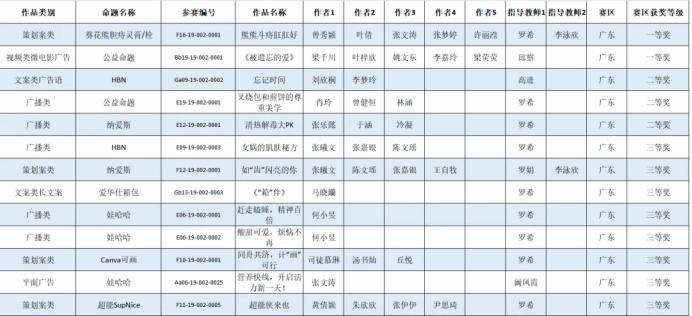 奖项涵盖视频类一等奖,文案类二、三等奖,策划案类一、三等奖,广播类二、三等奖,共31位同学在本次比赛中崭露头角。这些为广东分赛区的获奖作品,接下来会送至总赛区进行最终评定。