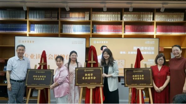 活动中,龚鸣副董事长、文传公司经理孙立教授、文传公司中国语言文学系主任周凤玲教授、网络与新媒体主任系胡美香教授、新闻与传播系主任陈珂副教授等共同为三个专业的读书会揭牌。专业读书会负责本专业阅读推广工作,通过向同学推荐专业阅读书目,组织开展阅读分享活动,助力专业人才培养与同学成长。