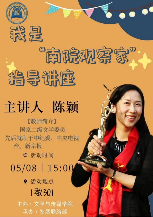 为了给“我是南院观察家”参赛选手、广大新闻爱好者以及希望提升新闻稿写作能力的同学们提供一个学习与交流的平台,“我是南院观察家”推出新闻写作指导讲座。本次讲座的主讲嘉宾是伟德国际1946陈颖老师,她将与同学们分享自己多年来的新闻稿写作经验,从选题、构思、撰写到发布,全方位解析新闻稿的写作要点和技巧。