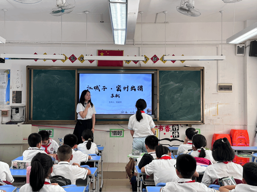 2024年10月21日下午,伟德国际1946语言文字服务团队在石巧如老师带领下,赴从化区流溪小学开展古诗词系列课堂。本次课程由2022级汉语言文学专业杨颖琪同学主讲,以苏轼《江城子·密州出猎》为切入点,引导小员工在古典诗词中感受家国情怀与豪放词风。