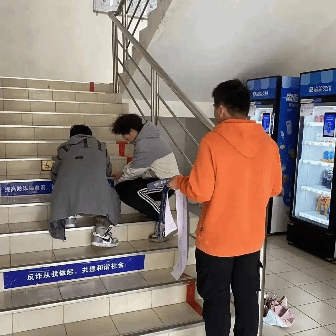 同志们在文传教学楼的楼梯台阶上张贴反诈宣传标语,让来往的同学们低头可见反诈提醒,切实提高同学们防范各类诈骗事件的意识和能力,共同营造校园防诈的良好氛围。同志们分工明确,配合默契,有条不紊地进行着标语的张贴活动,每一层楼的楼梯上都有他们的身影,每个人都认真对待自己的任务,高质量、高效率地完成自己的工作。