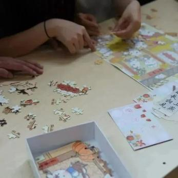 一块块拼图散落在桌面,好似浪迹在世界各地的游子,需要一股力量的指引返回到原来的家园与亲友共聚,如此才能称为完整。大家在拼图的过程中仔细寻找失落在外的“拼图”,一块也没有落下。