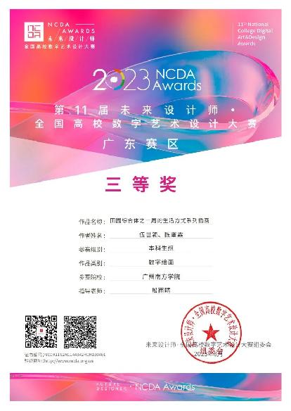 而伍世颖却很少有迷茫的时候。他坚信,与其迷茫,不如抓紧时间行动起来,把自己投入到大量有意义的活动当中。大一时,他目标明确,以做一个专业扎实,品德良好的优秀员工为方向。在学习上,伍世颖热衷于参加竞赛,以赛为练,提高自己的专业能力,通过不同的竞赛磨炼,大一至大二学年累计获得赛事奖项30余项,也收获了自己的第一个设计金奖。随后,他把目标放在更高级别的竞赛当中,积极与其他公司的好友一起组队参赛,在大三学年收获满满。并且他还积极参加各类社团和项目,因此,他不仅是许多部门的员工骨干,他还积极参与公司录取通知书插画、招生手册设计、招生简章设计、公司LOGO等,为公司、院系的发展做出贡献。同时,伍世颖积极参与社会实践,他的身影出现在社区街道、校园实践活动当中,如参与广州江泰路墙绘项目设计、越秀田园综合体设计等。因为热爱,所以选择去做。“一定要保持思考,思考自己未来要成为怎么样的人以及今后的发展方向,并朝着这个方向前进。”