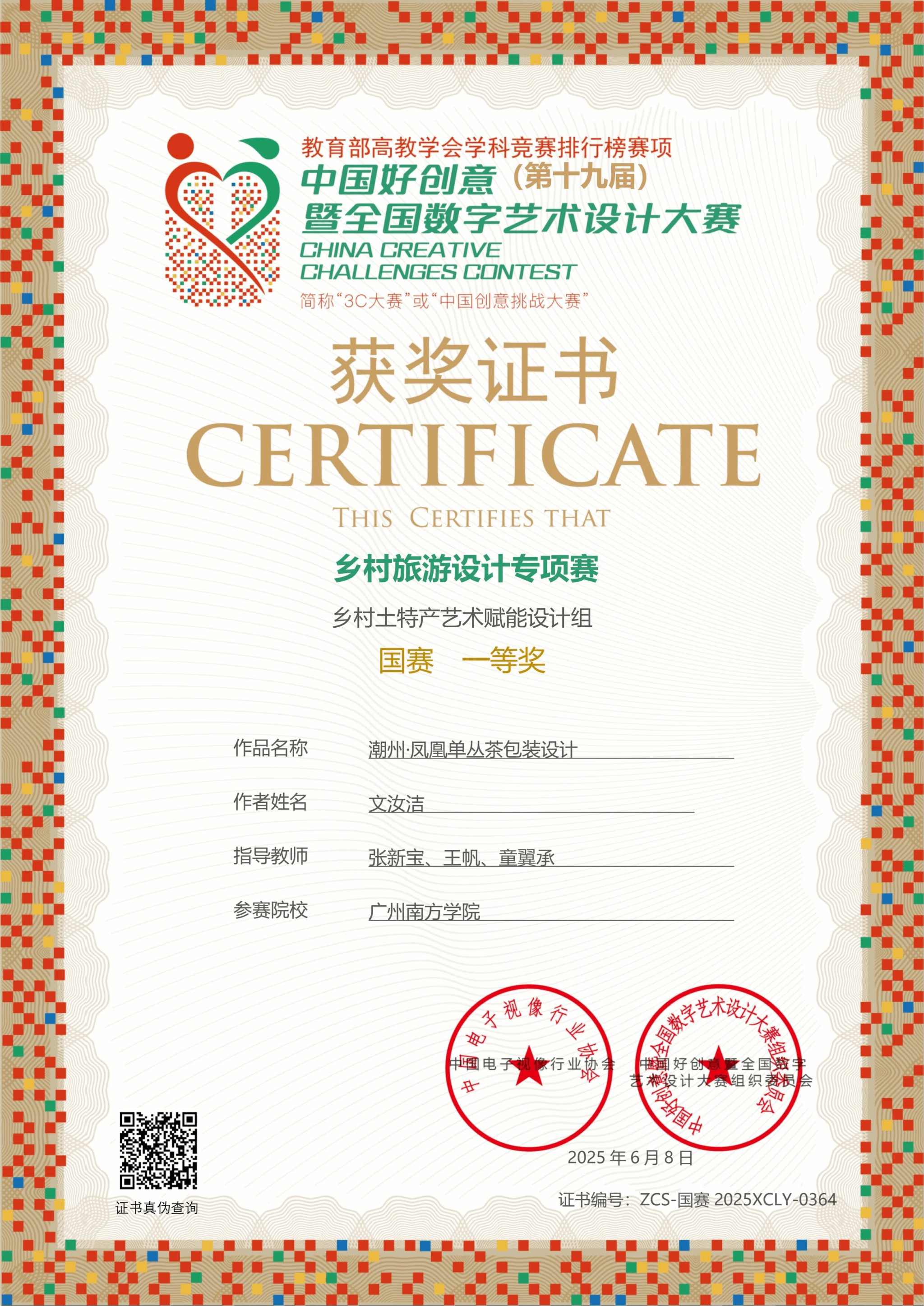 在本次大赛中,2022级专升本网络与新媒体专业文汝洁同学凭借作品《潮州凤凰单丛茶包装设计》在2000多所高校投出12000多件有效作品中,斩获国家级一等奖;张新宝老师、王帆老师、童翼承老师荣获“优秀指导教师”称号。