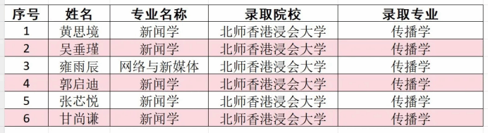 据统计,29人被境内高等院校录取,录取院校如中山大学、华南理工大学、郑州大学、上海师范大学、湖南师范大学、广州大学等,录取信息如下:
