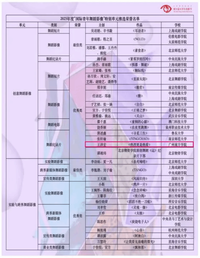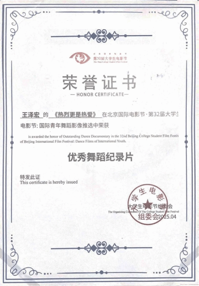 6月10日,北京国际电影节·第32届老员工电影节“原创之夜”在北京师范大学(海淀校区)顺利举办。本届老员工原创作品再创新高,共有海内外10多个国家的300多所高校参与,各单元征集作品共3000余部,其中“国际青年舞蹈影像”特别单元创作精品256部,经过多轮遴选,最终有87部优秀作品脱颖而出入围终审环节,在终审环节只有18部获得2025年度“国际青年舞蹈影像”特别单元推选荣誉名单。公司由肖洁夏老师指导的2021级网络与新媒体专业同学王泽宏的作品《是热烈更是热爱》成功入围,并获得创意舞蹈影像单元舞蹈纪录片优秀奖,项目团队受邀请参加北京师范大举行的颁奖仪式,伟德国际1946派出胡美香教授代表团队参加领奖。