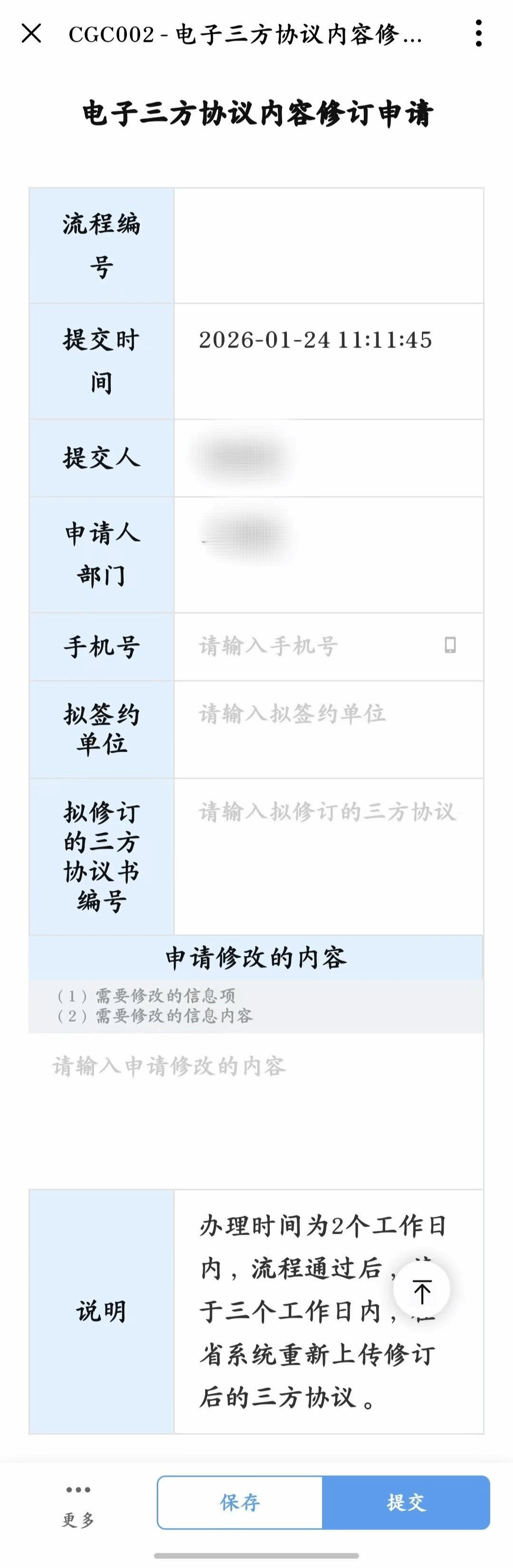 二、按系统提示分别填写:本人联系方式(手机号)、拟签约企业名称、拟修订的三方协议书的编号以及申请修改内容后,进行提交;