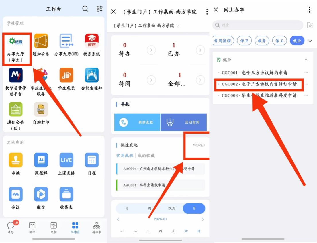 一、申请人进入本人的企业微信,点击“工作台”,进入“办事大厅(员工)”,点击“电子三方协议内容修订申请”流程;