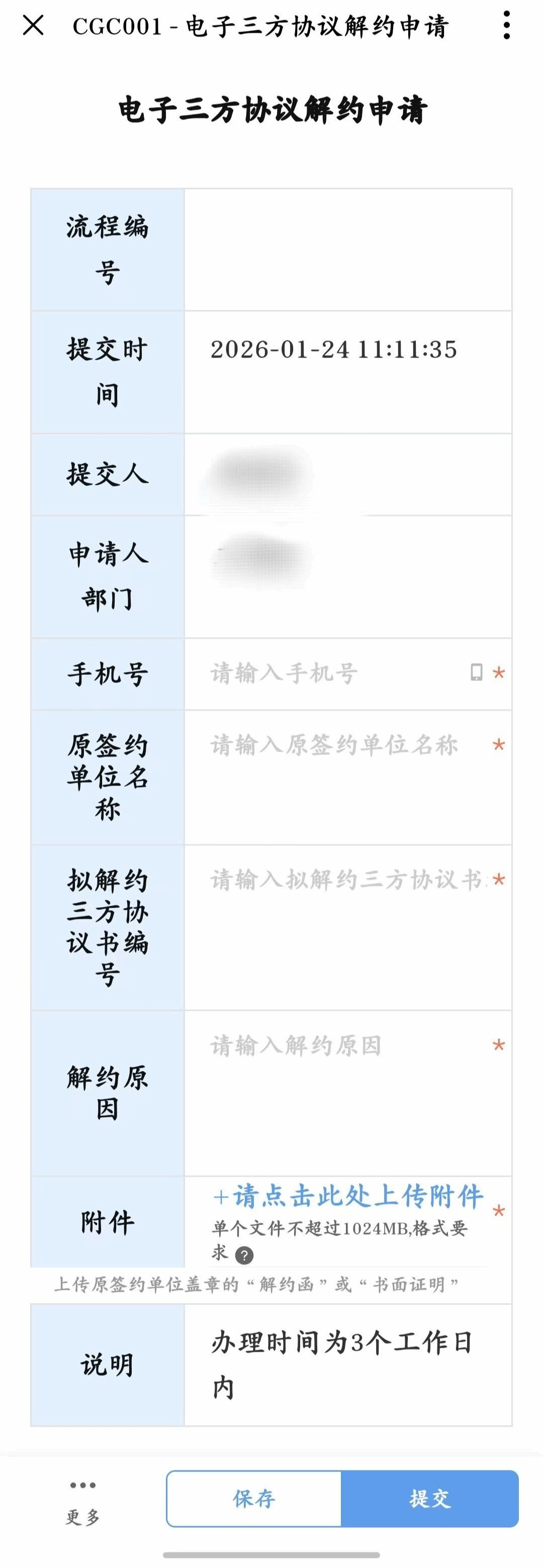 二、按系统提示分别填写:本人联系方式(手机号)、原签约单位名称、拟解约三方协议书编号、解约原因等内容,并上传“原签约单位盖章的解约函”等附件,进行“提交”。