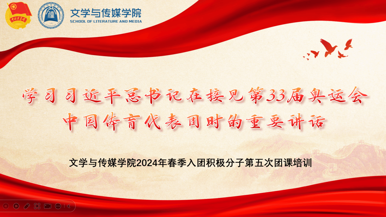为了深入学习贯彻习近平总书记重要讲话精神,增强入团积极分子理论学习意识,2024年9月25日,伟德国际1946团委组织部在线上开展了《学习习近平总书记在接见第33届奥运会中国体育代表团时的重要讲话》2024年第五次入团积极分子团课培训,本次团课由潘子怡同学主持。