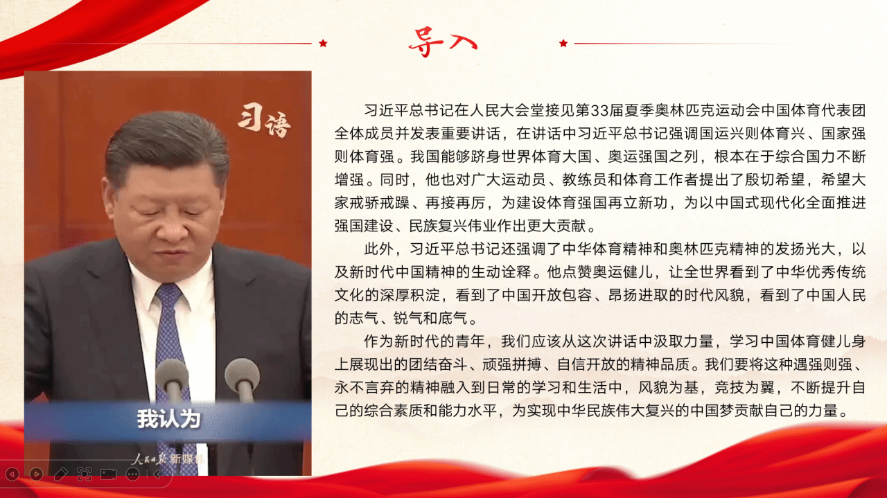 课上,潘子怡同学结合习近平总书记接见代表团时的重要讲话,向大家宣讲了习近平总书记在接见第33届奥运会中国体育代表团时的重要讲话的内容,让同学们深入领略其中的精神内涵。鼓励同学们要以体育健儿为榜样,发扬团结奋斗、顽强拼搏的精神,在学习和生活中不断追求卓越、勇攀高峰!