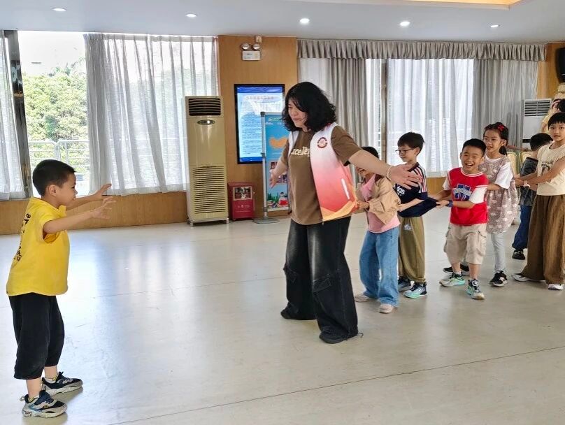 严肃课堂之外,是老鹰捉小鸡的追逐嬉闹,是“前方打仗,后方支援”的团队协作游戏。最动人的画面定格在最后一天:素来以严格著称、被小朋友们私下称为“黑脸教官”的廖金勇老师,竟主动加入老鹰捉小鸡的队伍!他笨拙又努力地张开双臂保护身后的“小鸡仔”,小朋友们的笑声几乎掀翻屋顶。那一刻,文鼎筑梦传薪队全体队员都抛开了老师的身份,和小朋友们滚作一团,汗水与笑声交织,纯粹而炽热的师生情谊在阳光下熠熠生辉。